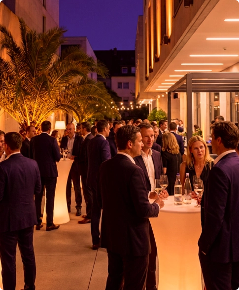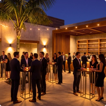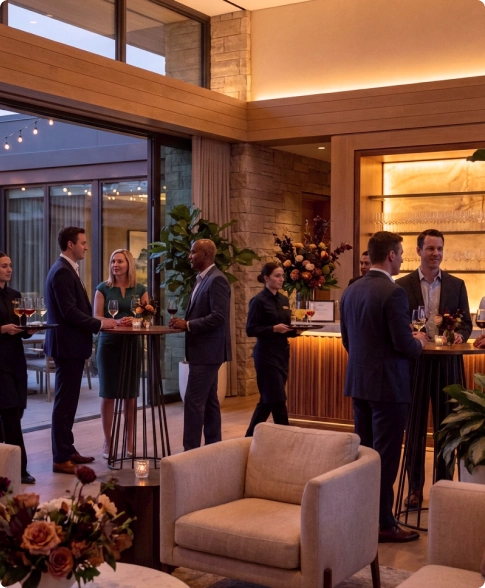 Serviços essenciais ao projeto: Para garantir a excelência da entrega, integramos ao escopo tudo o que seu evento necessitar: Alta gastronomia, Cenografia, Staff, Valet e Audiovisual avançado.